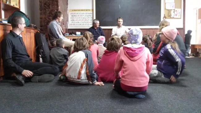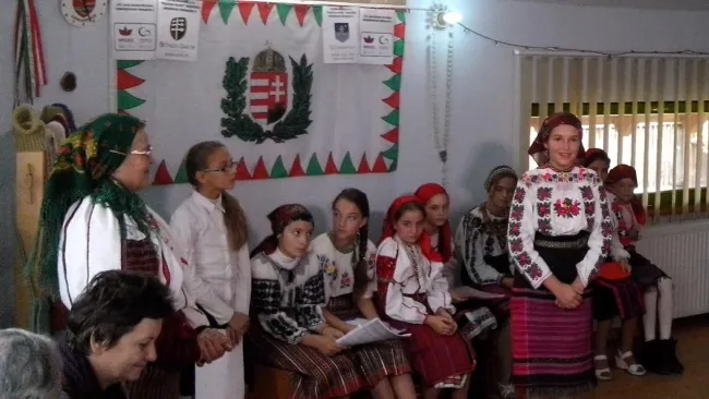 A következő helyszín Magyarfalu, már valóban a magyar nyelv keleti végvára, Budapesttől majdnem 900 kilométerre. Itt már több korosztály tanulói vettek részt a foglalkozáson, ahol a magyartanár házaspáron túl a helyi hagyományőrzők is jelen voltak. A faluban nyáron több folklóresemény van, sőt a tánccsoport a budapesti csángó bálon is szerepelt idén. A moldvai csángó falvak közül az egyik legjobb magyar nyelvi állapotban lévő közösség ez. A hagyományőrzés ellenére meglepetten tapasztaltam, hogy a vidék nemrégiben letűnt, emblematikus jelentőségű hangszerét, a kobozt a gyermekek már nem ismerik föl. Nem volt tehát haszontalan a hangszerbemutató, melyet itt is táncház követett. A daltanulás után nagy örömmel hallgattuk a helyi asszonyok hosszú versszakokban kanyargó énekeit.