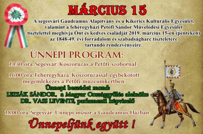 A segesvári Gaudeamus Alapítvány és a Kikerics Kulturális Egyesület, valamint a fehéregyházi Petőfi Sándor Művelődési Egyesület szeretettel meghívja Önt és kedves családját, barátait, határon innen és túl, 2019. március 15-én, pénteken, az 1848-49-es forradalom és szabadságharc tiszteletére tartandó rendezvényeire!