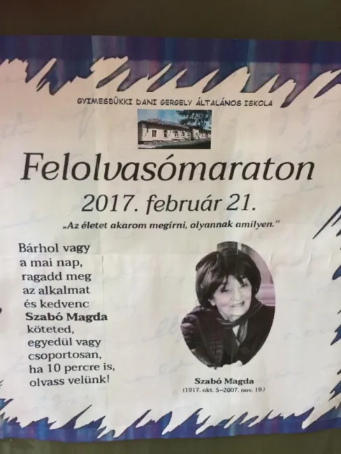 A gyimesbükki Dani Gergely Általános Iskola is bekapcsolódott a felolvasásba. A rendezvény alkalmából a diákok Szabó Magda, Álarcosbál című regénye kapcsán készítettek dekorációt, amelyet a felolvasáshoz berendezett tanteremben helyeztek el. A rendezvényt az iskola magyar tanára, Antal Erzsébet szervezte meg. Az alsó tagozatosok az Álarcosbál című regényből olvastak fel részleteket, a felsőbb évesek pedig a Születésnap sorait elevenítették fel a résztvevők számára. A gyimesbükki Líceum 9. és 11. osztályos diákjaival a Mondják meg Zsófikának című regényből olvastunk fel részleteket.