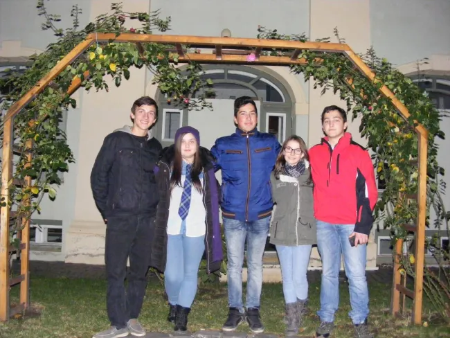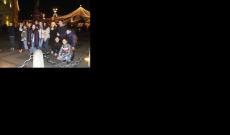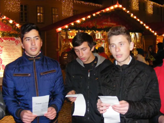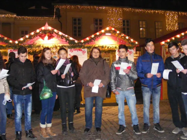Ebben a szép pillanatban vettük elő tarsolyunkból dalunkat és bátorságunkat. A diákok picit izgulva, lámpalázzal, a dalszövegbe (kottába) belekapaszkodva, félkört alkotva elkezdtek énekelni. Először németül, majd magyarul, angolul, végül románul énekeltük el a "Csendes éjt".