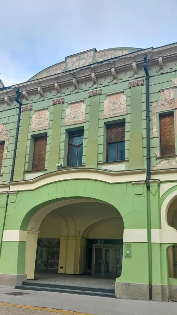 A banki palotának által, egy könnyedebb külsejű, a Jugendstil vagyis müncheni szecesszió jegyeit viselő ház áll. Megfigyelhető, hogy eredetileg nem a szecesszió stílusában tervezték meg, az építésekor még klasszicista épület 19. századi homlokzatát Mačković Titus, a város főépítésze adaptálta a kor ízlésére1904-ben. Egykoron az Arany Bárány Szálló működött benne, mely név talán ebben a formában nem cseng olyan ismerősen, de ha azt mondjuk sárszegen Vajkay Ákos itt fogyasztotta el a bográcsgulyást, borjúszegyet és vaníliás metéltet, akkor a szépirodalom kedvelőinek derenghet valami. Ugyanis Kosztolányi Dezső, Szabadka híres szülötte, gyakran megfordult a szálló kávéházában, és innen merített ihletet Pacsirta című regénye sárszegi nagyvendéglőjének, a Magyar Királynak megformálásához.