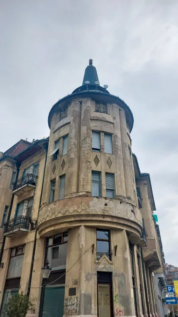 A főtérhez felé közeledve már emelkedik az előttünk a monumentális városháza, de még mielőtt még odaérnénk, érdemes egy kitérőt tenni a Városi Könyvtár irányába. Most nem a bejáratnál görnyedő atlaszokra helyezzük figyelmünket, hanem a szomszédban álló, elsőre tájidegennek ható bérházra. A mára már megviselt állapotban lévő városi bérpalotát 1912-ben építette az akkor még ismeretlen Vadas Pál. Letisztult, geometrikus formák és díszítések alkotják, melyek a szecesszió egy másik iskolájának, a kései bécsi stílus a jellegzetességei.