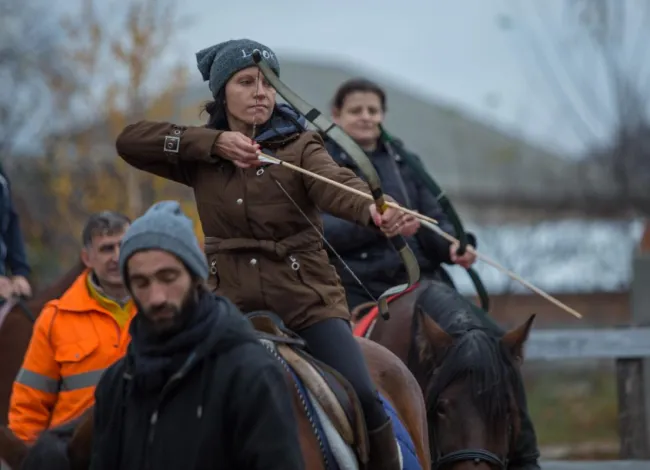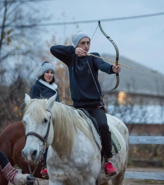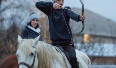 A rövid, közös ebéd után fölnyergeltük a lovakat, és csoportbontásban lovasíjászkodtunk, illetve íjászpárbajoztunk. Igaz, hogy a többség csak lépésben, kantáron vezetett lóval, sőt földi kísérettel. Margitics Erik lovas oktató a legkisebbek mellett gyalogolt, hogy még véletlenül se essen le senki, de mindenki lőtt lóhátról. Az élmény hatalmas volt. Ez kell a magyarnak, nem a sok mai butaság. A végén, mikor a 6 óra edzésidő lejárt, még könyörögtek, hogy folytassuk. Így hát mit van mit tenni, folytatjuk legközelebb, december 16-án, aki arra néz, térjen be a Szelíd Lovas Farmra!
