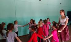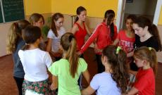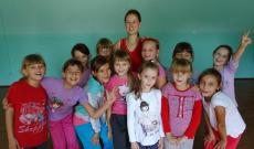 A Munkács melletti faluban három korosztályban alakítottunk néptánc csoportokat, minden hétfőn és kedden találkozom velük. Az 1-2. osztályosokkal népi játékokat, népdalokat, mondókákat tanulunk, a hangsúly pedig a játékon van, hiszen óvodában ők kimaradtak ezekből a foglalkozásokból. A 3-4. osztályosokkal ritmusjátékokat gyakorolunk, ugróiskolázunk, Dunántúli ugrós alaplépéseket veszünk, és velük is rengeteget játszunk.