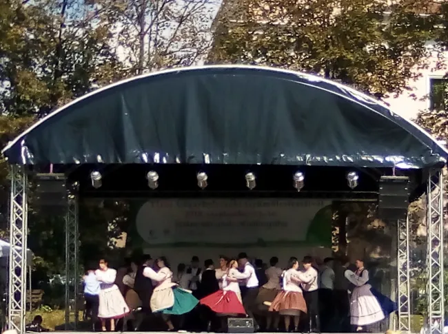 Péntek délután Székelyudvarhelyen részt vettünk a felvonuláson a buszállomástól a Patkóig, ami a főtéri templom mögötti tér megnevezése. A város három pontjából indult felvonuló csoportok számos zenésszel az élükön itt találkoztak, itt szólalt meg egyszerre minden hangszer. Onnan minden táncos, zenész továbbvonult a Sportcsarnokba a táncházas nyitógálára, ahol széki, székelyföldi, kalotaszegi, felcsíki és moldvai táncok is megmutatkoztak egy-egy tánccsoport vezetésével, amelybe bárki szabadon bekapcsolódhatott. Este pedig egyszerre három helyszínen különböző táncrendeket húztak a zenekarok, emellett a kinti sátrak alatt az asztaloknál kisebb folkkocsma-kavalkádban szólt a zene reggelig.