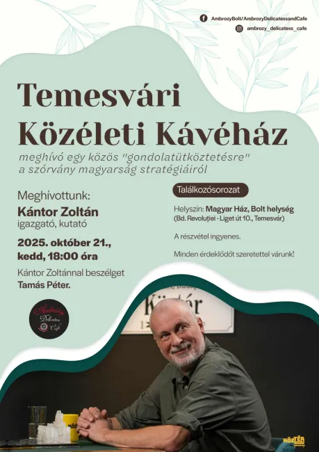 2025. október 21-én, kedden este 6 órától Temesváron a Magyar Házban lévő Ambrózy Delicatess and Caféban a Temesvári Közéleti Kávéház új évadának első eseményére került sor, ahol Kántor Zoltán szociológus, politológus, egyetemei docens, a Nemzetpolitikai Kutatóintézet igazgatója és a Pázmány Péter Katolikus Egyetem Nemzetközi és Politikatudományi Intézetének igazgatója tartott előadással egybekötött beszélgetést „a szórvány magyarság stratégiáiról”. A beszélgetést Tamás Péter, Temesvár tiszteletbeli konzulja és a Várbástya Egyesület elnöke vezette. A közéleti kávéházi sorozat újabb előadása a szórványlét kihívásaira, az intézményes és közösségi megmaradás lehetőségeire összpontosított; célja ezúttal is a közös gondolkodás előmozdítása volt.