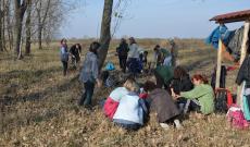 Útközben az útjelekről, térképészetről kaptak képzést a résztvevők, majd a helyszínre érve a környezetről. Szelíd kis középkori templomalap rajzolódott ki a közelben, mellette kereszttel, kopjafákkal és rövid leírással. A csöppnyi kulturális részt a tűzrakás-képzés váltotta fel, majd az ebédkészítés. Újból rengeteg információval gazdagodott mindenki, hogy hogyan kell a konyhai kényelmet elhagyva takarékosan, gyorsan finomságot varázsolni a bográcsba, majd azt kevés vízzel elmosni - megjegyzem, a homok és hamu keveréke csodákra képes. Az ebédet követően bemutattak egy ponyvából épített menedéket. Három csapatra oszlottak a jelenlevők, és mindegyik csoport megépítette a maga menedékét - a képek magukért beszélnek.