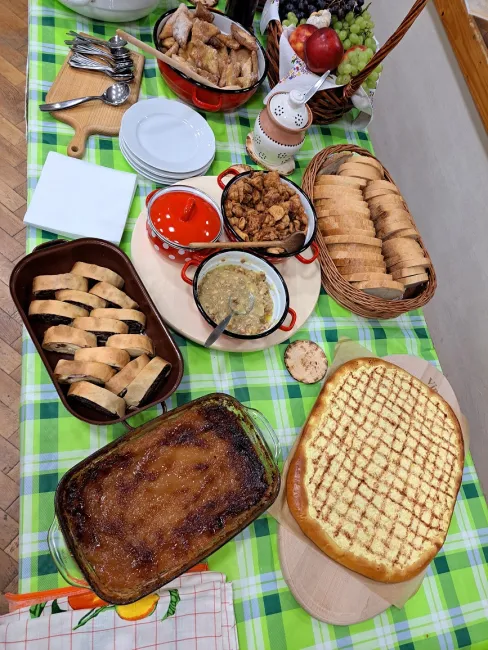 A terem nagyon szép, hangulatos díszítést kapott sok önkéntes közreműködésével. Különös ételekkel várták a vendégeket, a vacsorát két körben tálalták. Olyan izgalmas ételeket is kóstolhattam, mint a csíramálé. Ez a különös édesség a magyar parasztkonyha egyik legrégebbi édes süteménye, mégsem ismertem. Megtudtam az elkészítésének titkát is, és nagyon meglepődtem, amikor megtudtam, hogy a fő összetevője a ledarált csíráztatott gabona.