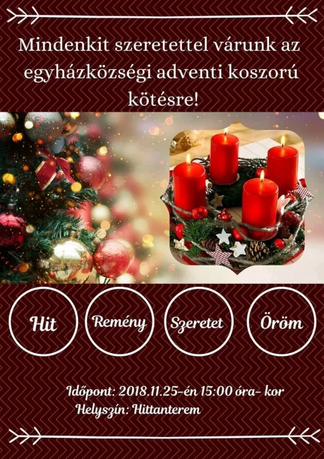 Az egyházközség a régi hagyományokat felelevenítve megszervezte, hogy advent első vasárnapját megelőző vasárnapon gyerekek és felnőttek együtt készítsenek adventi koszorúkat. Hiszen az advent az ünnepre való ráhangolódás időszaka, a gyertyák fényei pedig a hit, a remény, a szeretet és az öröm megtestesítői, amelyek elengedhetetlen kincsek az életünkben. A görögkatolikus parókia hittantermébe már 15 óra előtt elkezdtek érkezni az emberek és izgatottan vették szemügyre az asztalokra már előre gondosan kihelyezett alapanyagokat. Az esemény összehozta a családokat, a barátokat, kellemes adventi zenék hallgatása mellett készítették el a szebbnél szebb koszorúkat, és segítettek egymásnak a kötésben, ragasztásban, tanácsot adtak, hogyan lesz még szebb egy-egy koszorú. A munka végeztével a hívek a templomba mentek, ahol Ábrány Krisztián atya megáldotta a koszorúkat és azt kívánta, hogy a gyertyák fényei vigyenek szeretetet az otthonokba, és az emberek tartsák meg hitüket minden időben.