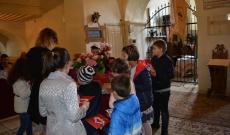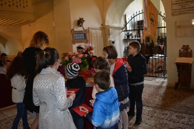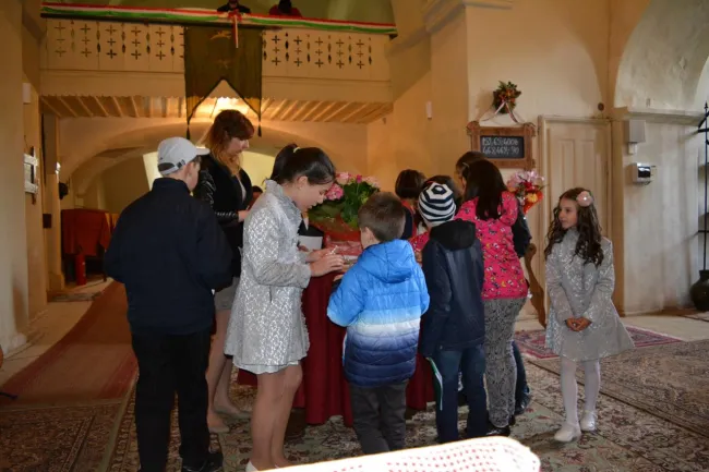 A gyerekek fényképpel ellátott képeslappal és az általuk kifestett szívecskékkel, valamint egy szál rózsával köszöntötték az anyukákat és a nagymamákat egyaránt. Nem felejtkeztünk meg azokról sem, akiknek már nincs kicsi, iskolás gyermekük, így a templomba ellátogató összes édesanyát köszöntöttük egy képeslappal és egy csokor orgonával.