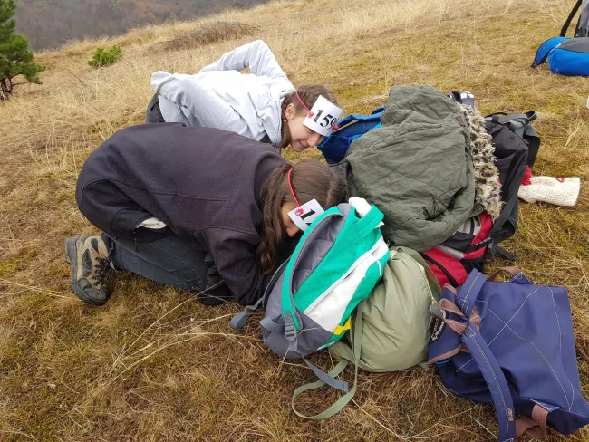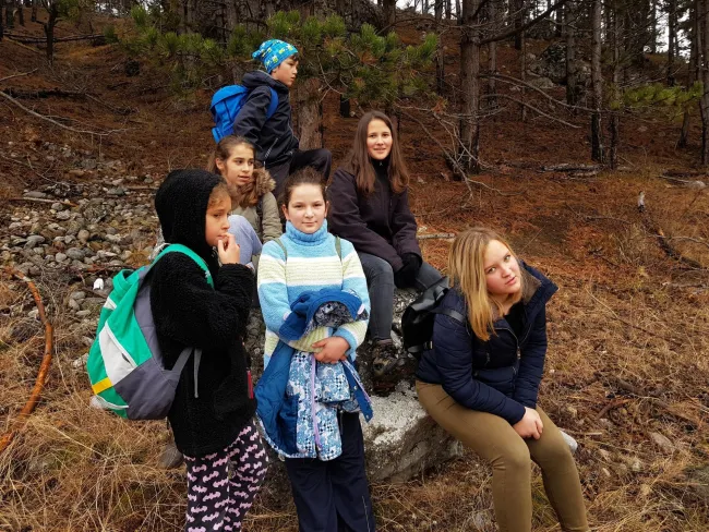 A hosszú játékban megéheztünk, így nekiláttunk a magunkkal hozott étel elfogyasztásának. Nem tűnődtünk sokáig, mert a hideg sokunkat átjárt. Ebéd után folytattuk utunkat fel a sziklára, ahonnan gyönyörű kilátás várt minket még annak ellenére is, hogy a párás hideg levegő nem oszlott el. A csodálkozás után elkezdtük megközelíteni a patakot. Meredek domboldalon kellett leereszkednünk. Szép tisztás tárult elénk, meg is beszéltük, hogy nyáron kijövünk ide sátrazni. Sajnos többen belemerítettük cipőinket a patak hűs vizébe.
