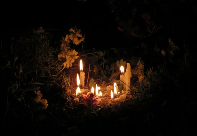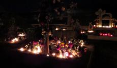 A megfelelő technikai feltételeknek hála a szentmise ugyanúgy zajlott, mint szokott, azzal a különbséggel, hogy jóval többen voltunk, mint ittlétem óta eddig bármikor. Mindenki, aki eljött a temetőbe, megállt elhunyt szerette feldíszített sírja mellett és (az áldozást leszámítva) egész szertartás alatt nem mozdult mellőle. A pirosló naplemente szeretetteljesen világította meg alakjaikat. Lóránt atya lélekemelő szavai, az élettel telt, ünneplőbe öltöztetett temető látványa és a megemlékezés őszinte és tiszta ereje mélyen megérintett. A rám bízott énekek megkezdése ez alkalommal egyáltalán nem bizonyult egyszerű feladatnak, szerencsére a türi énekkar, amellyel már több mint egy hónapja dolgozunk együtt, stabilan mellettem állt elérzékenyülésemben is. A gyönyörű szentmise után Lóránt atya körbejárta a temetőt, és családjaik jelenlétében megáldotta mindazok keresztfáit, akiket az elmúlt egy évben szólított magához az Úr. Mivel a hangulat meghittsége miatt nem tartottam etikusnak, hogy fotókat készítsek, így mindössze csupán a „világítás" legvégét örökítettem meg.