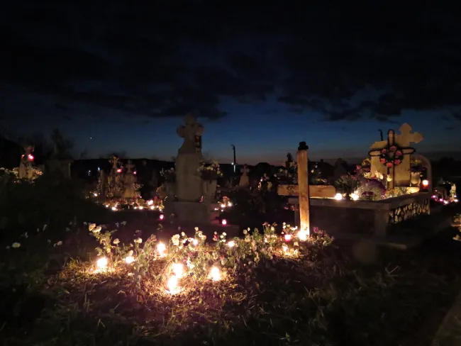 Ezen a napon a szokásos, téli időszámítás szerint 17 órakor kezdődő szentmise a türi római katolikus templom helyett a temetőben került megtartásra Kémenes Lóránt atya vezetésével. Nagy meglepetésemre a szertartás előtt fél órával már tele volt emberekkel ez a megszentelt hely. Mindenki szeretteinek sírjait gondozgatta, díszítgette, vagy éppen egymással beszélgettett. A sírokra virágokat tettek, a fejfák mögött fekvő, gyakran földdel fedett területekre pedig mécseseket és gyertyákat helyeztek, jóval többet, mint az nálunk odahaza szokás. A sírhelyek igazán "világítottak", a lenyugvó Nap fényének csökkenésével pedig ez a világosság egyre erőteljesebben és szebben érvényesült. Már ettől a látványtól nehéz volt szóhoz jutni, de mikor közelebb léptem egy-egy fejfához és elolvastam a rávésett neveket, teljesen elállt a szavam: Egytől-egyig magyar nevek voltak. Annak ellenére, hogy Türben sétálva magyar szót hallani szinte csoda, a temetőben hosszas járkálás után sikerült csak néhány romános névre találnom.