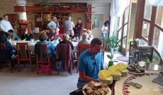 Délután a Lányi Ernő Iparos Művelődési Egyesület tagjai fogadtak bennünket. Vezetőjük, Mihályi Katalin mutatta be nekünk a 118 éves szervezetet és ismertette dalárdájuk működését, munkájukat. Az énekkaruk fejlesztése és a fellépéseikre, hangversenyekre való készülődés mellett nagy erőt fektetnek a vajdasági népi kézműves termékek készítésébe. Tradicionális mintákat, és a környékre jellemző technikákat használva hímeznek az asszonyok.