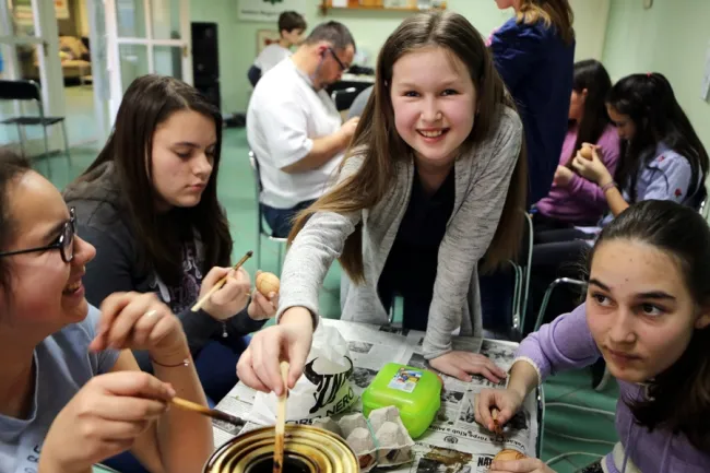 Az óvodások és iskolások évek óta a magyar ház állandó vendégei húsvét előtti héten. - Második évben az iskolásokat is bevontuk. Az igazgatóval megszerveztük az osztályok részvételét, majd a medgyesi magyar óvodások is becsatlakoztak. – teszi hozzá Gyöngyi. Miközben beszélgetünk, még kicsit megigazítja a viaszmelegítő szerkezetet – az utolsó simítások ezek, hiszen fél óra múlva érkezik a harmadik osztály. Az óvodások az óvónénik segítői kezeire is számíthattak és a hét nagy részén a MADISZ munkatársai is besegítettek, így kisebbek is csinos hímestojással és sikerélményekkel térjenek haza. Kérdésemre, miszerint mennyire nehéz a gyerekeknek a motívumok pontos megrajzolása, Gyöngyi egy csipet büszkeséggel mondta: „Évről évre ügyesebbek. A mintákat jól látható helyekre kifüggesztjük a teremben, ezek alapján választhatnak, de a szabad kreativitásukra is számítunk. A nyolcadikasoktól viszont szoktam kérni, hogy egy tojás mindenképpen a hagyományos, komplikáltabb hímzést kapja meg. Ők már képesek erre. És sokuknak valóban jól is megy. Fontosnak tartom, ha már megvan ez a tudásunk, akkor adjuk át. Évről évre ez motivál a szervezésben.”