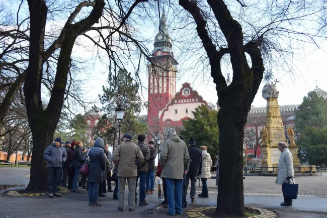 A Tanács megtekintése után idegenvezető csatlakozott hozzánk, aki bemutatta az 1908-10 között megépült szecessziós Városháza épületét, mesélt a belváros magyar vonatkozású részeiről, majd elsétáltunk a magyar kormány segítségével éppen felújítás alatt álló Zsinagógához. A délután további részében lehetőség nyílt az adventi vásár megtekintésére.