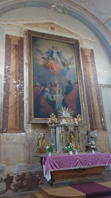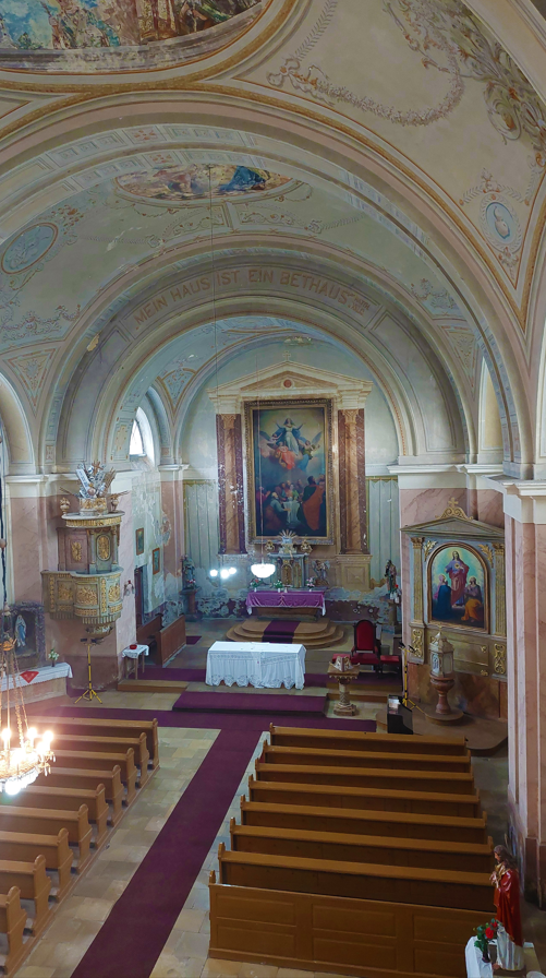 Az oltárkép Kalocsáról származik. A templom alatt kripta található, amelyben az építtető, Polimberger földi maradványai nyugszanak; a kriptát az idők során többször is feltörték.