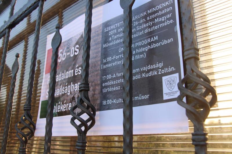2019. október 26-án megemlékezést tartottunk Hertelendyfalván az 1956-os események kapcsán. A program során Kudlik Zoltán, a vajdasági Nagy Imre Társaság elnöke tartott előadást a forradalom és szabadságharc vajdasági történéseiről, valamint a helyiek kulturális műsorral színesítették az ünnepséget. A rendezvény helyszíne a Tamási Áron Székely-Magyar Művelődési Egyesület díszterme volt, amelyre Keveváráról, Sándoregyházáról és Pancsováról is érkeztek érdeklődők.