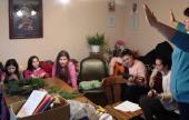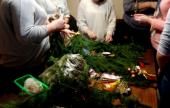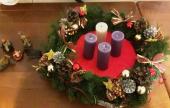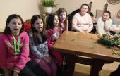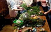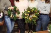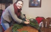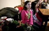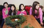 A foglalkozás szombaton délután három órakor, a Szent Család karitászházban vette kezdetét, ahol adventi koszorúkat és más karácsonyi dekorációkat készítettünk. A karitászvezető Ruszányuk Zsuzsa néni meleg teával, szalagokkal, díszekkel, kézműves eszközökkel és karácsonyi zenékkel várta a kicsi és nagy gyerekeket. Tőle kaptuk a helyet és minden nyersanyagot. Karácsonyi énekekkel és vidám beszélgetéssel hangolódtunk. Végül kezdetét vette a munka. Hiába szúrtak a tűlevelek, a kicsik elszánt lelkesedésessel készítették az ajtódíszeket.