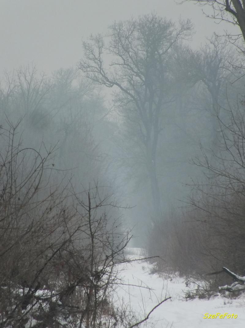 Csak a lépéseim nyomán előcsalt hóropogás monoton neszezésének hallgatása, a fehér háttérre rajzolt sötét fatörzsek "vonalkódjának" szemlélése jelenti most számomra a teljes információfogyasztást. Néhol szétszóródott csöppnyi piszkosarany levélhullák csoportjai pettyezik a vadak nyomától érintetlen aprócska hósíkokat, máshol rókatappancsok, fácánvirgácsok lenyomatai viszik tova magukkal a tekintetemet. Időnként finom zúzmaraszitálás frissíti arcom, vagy valami ragadozómadár kurta rikácsolása zökkent ki egy-egy pillanatra ebből a varázslatból. Az enyhe ködlésből lassan tűnik elő a Maros, aminek a partjához leérve egy (talán) szürke gém riad föl jöttömre.