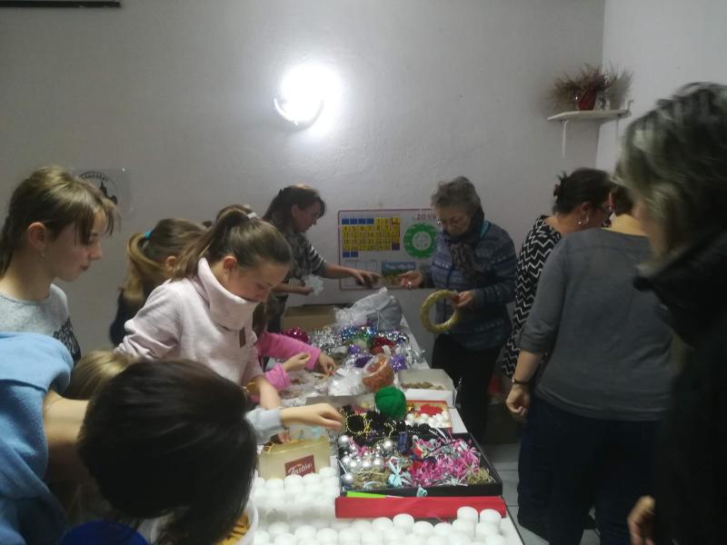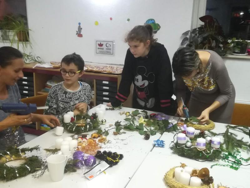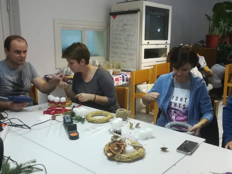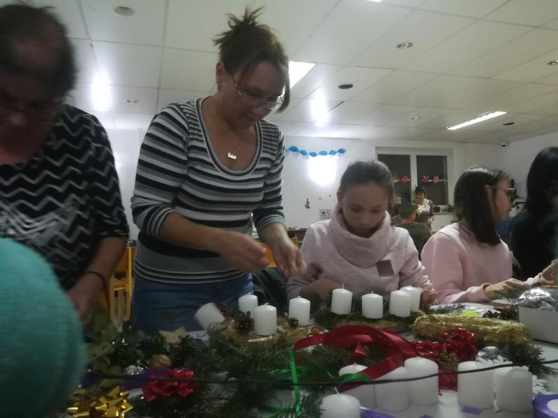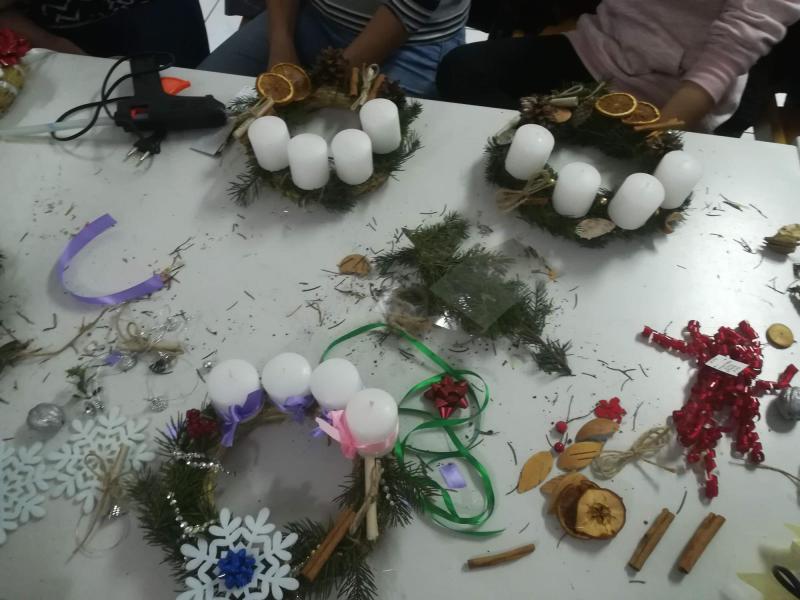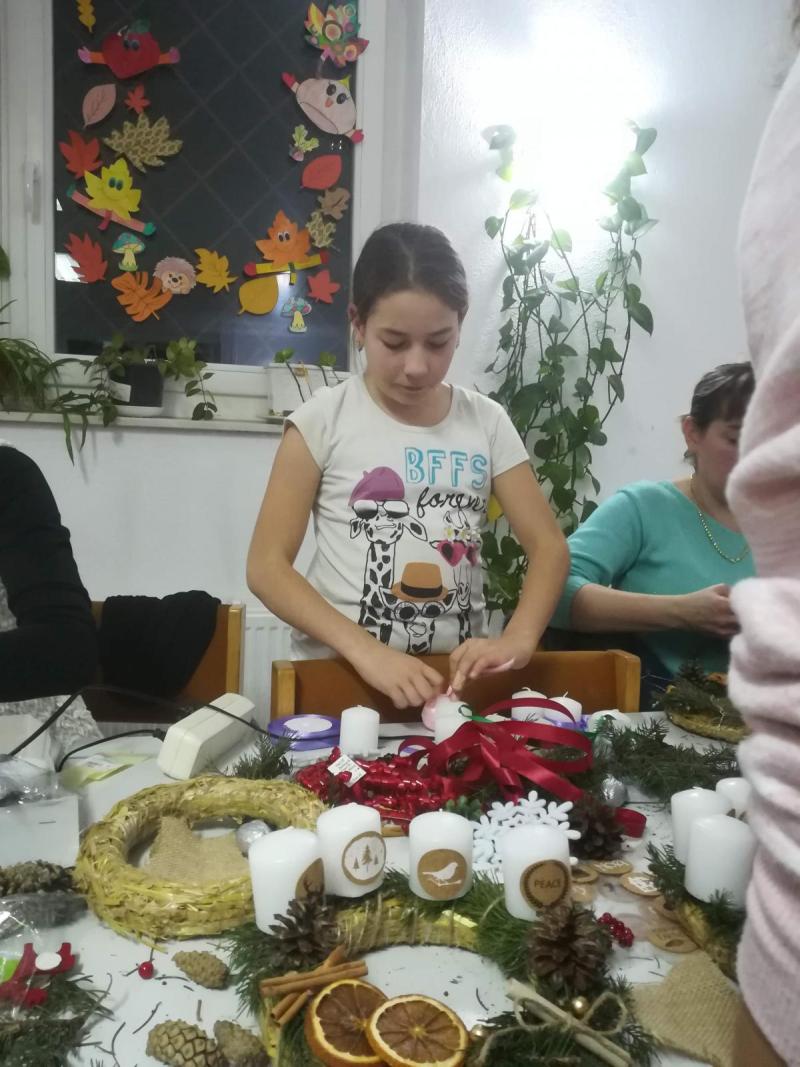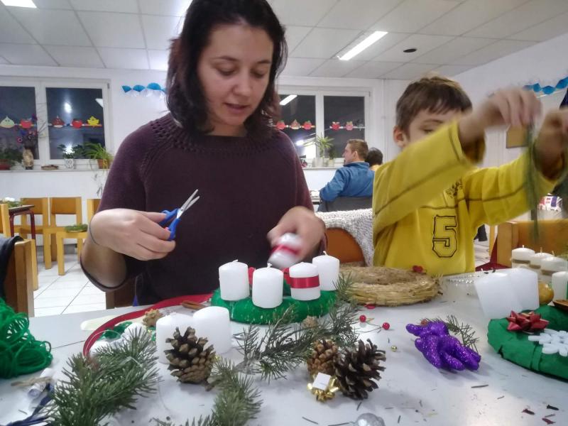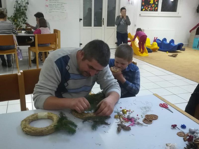 Kőhalomban egy esti, baráti összejövetelen a gyermekek szüleikkel együtt adventi koszorút készítettek november 27-én. Nagy egyeztetéssel kezdődött az este, hiszen minden családtagnak megvolt a véleménye, hogy milyen színű és milyen stílusú legyen a koszorú. Miután sikerült az összes elképzelést egésszé formálni, nekiláttak a munkának. Volt ott zsíros kenyér, meleg tea, karácsonyi zene, apa, anya, barátok... minden, ami egy jó estéhez kell. Családonként két koszorút készítettek, az egyiket hazavihették, hogy vasárnap meggyújtsák rajta az első gyertyát, a másikat pedig ott hagyták, s az egyházközségben megrendezett karácsonyi vásárban értékesítették azt a napközis foglalkozások javára. Nagy kincs, amikor a család együtt töltheti az időt, s ha mindezt a nagyobb közösségben teszik, az élmény még különlegesebb.