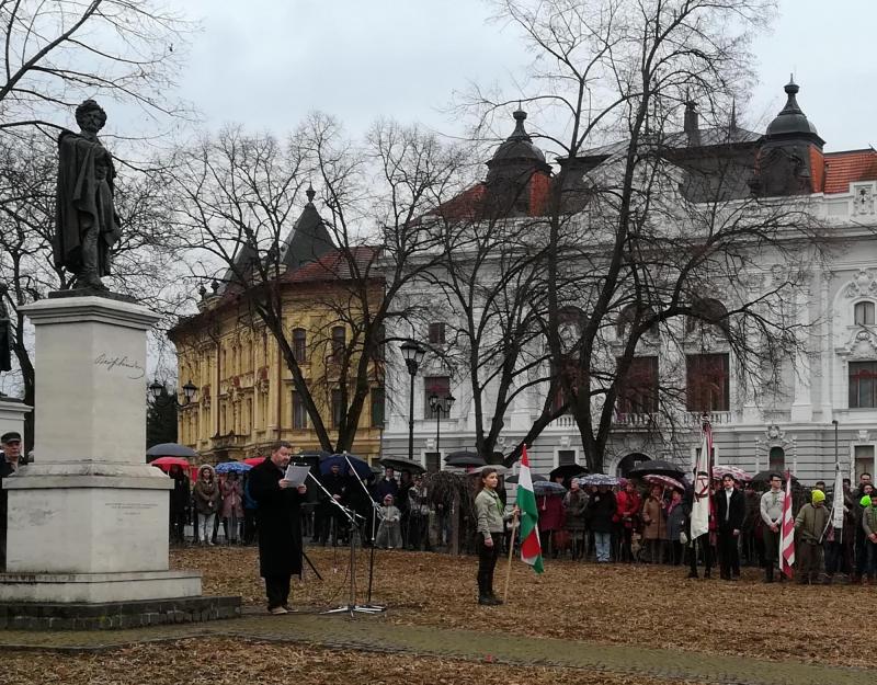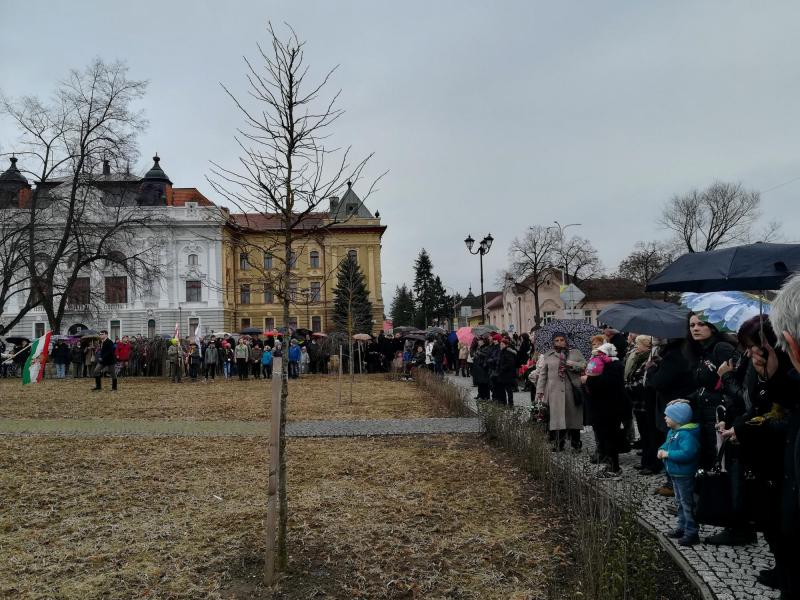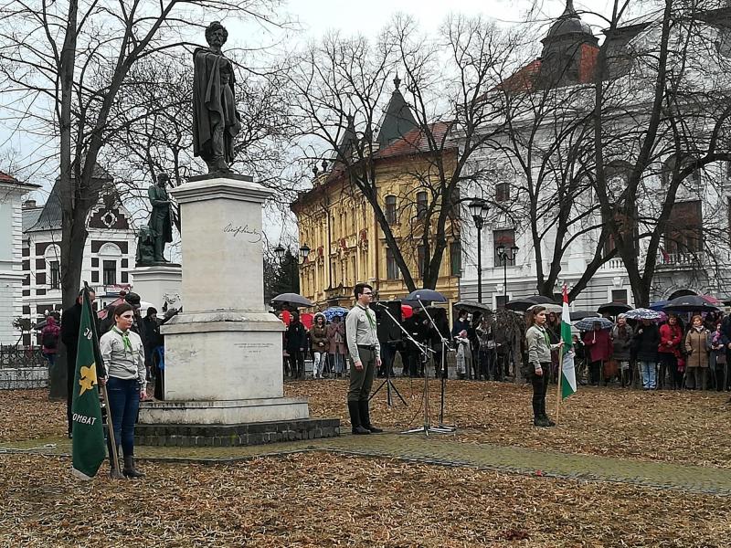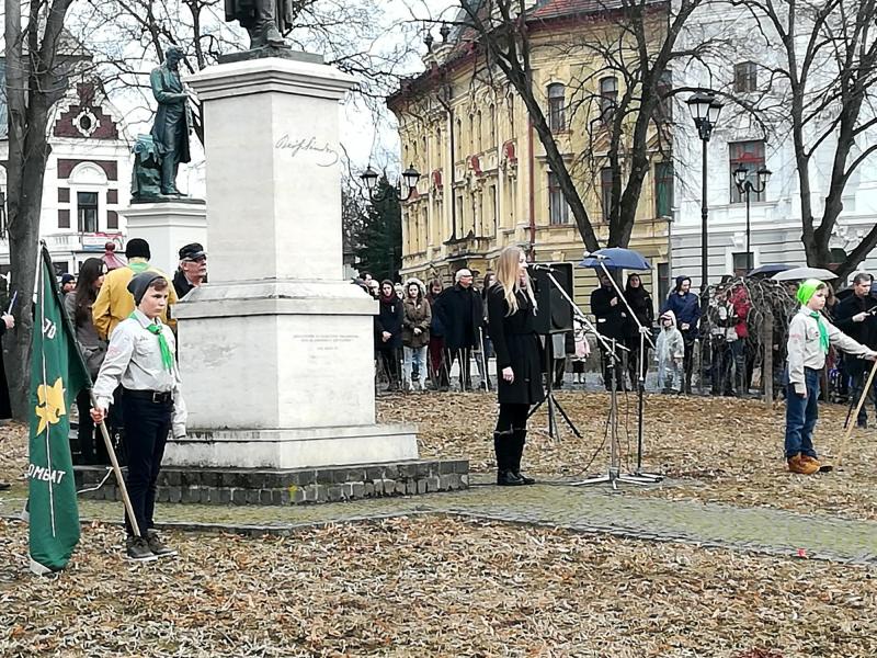 A rimaszombati 4. sz. Hatvani István Cserkészcsapat lelkes fiataljai álltak díszőrséget dacolva az egyre inkább elszomorodó idővel. Gál Laura, a Tompa Mihály Református Gimnázium diákjának szavalatát Mács Mihály és Bodolló Nikol műsora követte, kik többek között a Nemzeti dal megzenésített változatát adták elő. Őket követte Szászi Zoltán költő, író ünnepi beszéde, végül Pataky András az Ivana Kraska Gimnázium tanulója Heltai Jenő: Szabadság című versét adta elő. A koszorúk ünnepélyes elhelyezését követően a hivatalos megemlékezés lezárásaként felcsendült a Szózat.