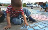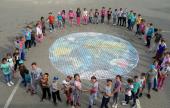 Délután az elemi iskolás bentlakókkal egy óriási Föld térképet színeztünk ki az alapítvány udvarán. Kis csapatokban dolgoztak a kontinenseken, óceánokon. A közös alkotás végén kézfogással körbevettük a Földet.