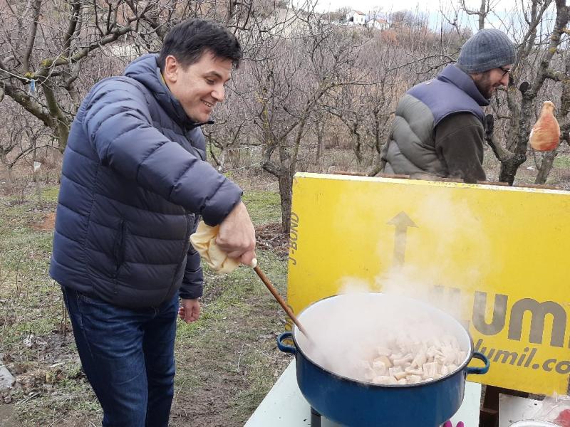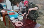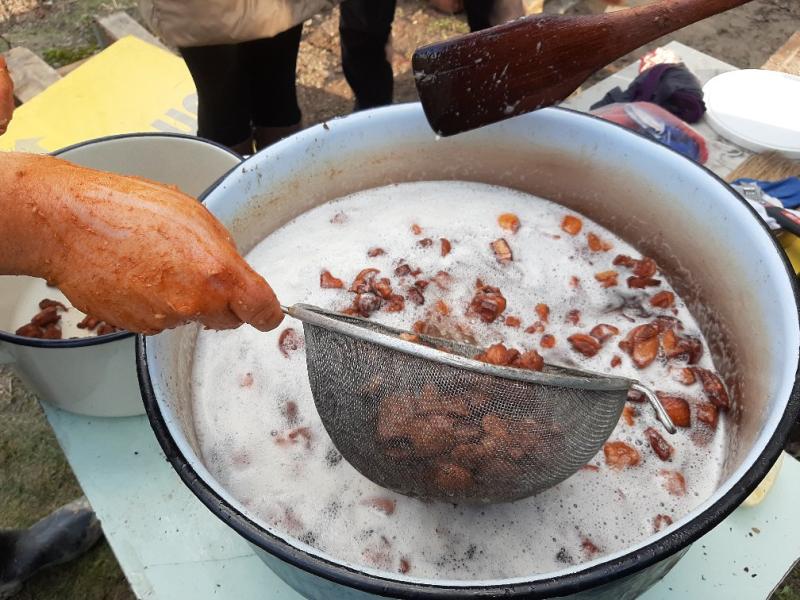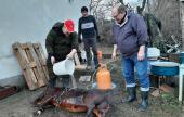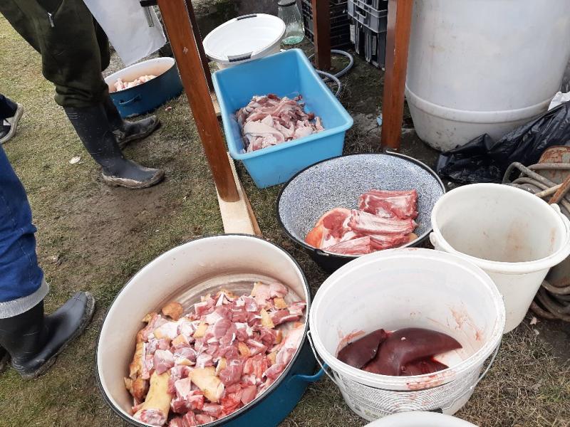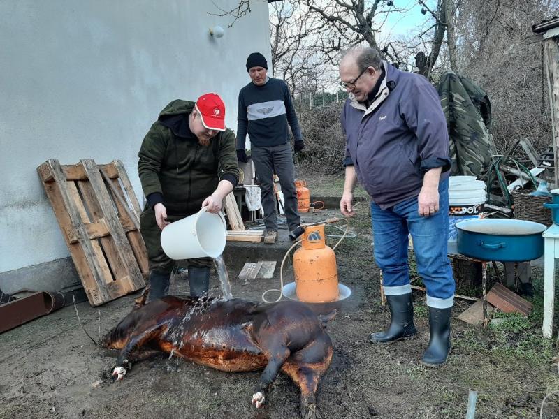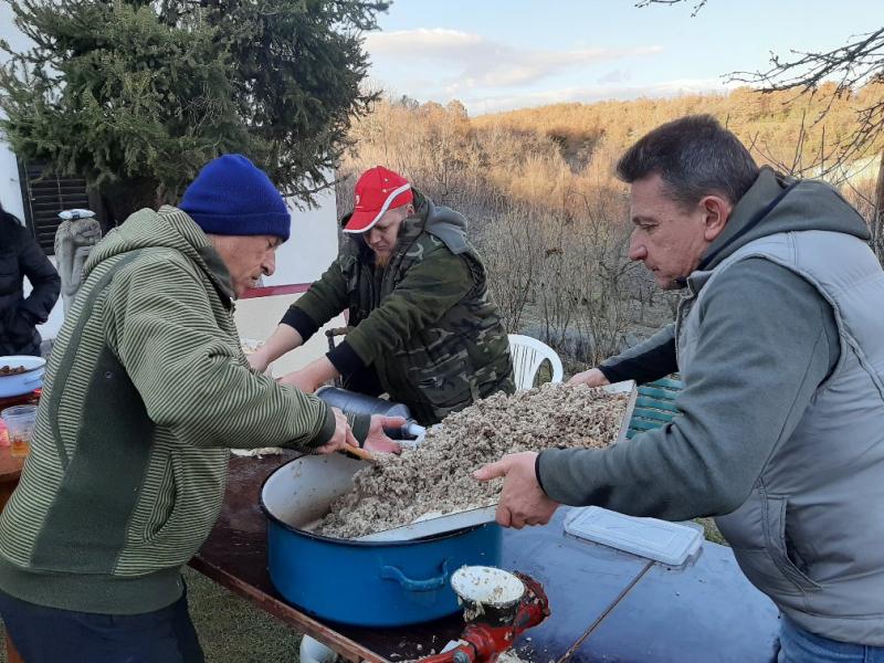 A Teleház tagjai és a magyar külképviselet dolgozói már korán reggel gyülekeztek, hogy nekilássanak a munkának. Hagyományosan reggelire sült vér készült, majd egy-egy zamatos pálinka után a rengeteg feladat szétosztása következett. Sokan bekapcsolódtak a munkába, így a nap végére el is készült a hurka, kolbász, abált szalonna, disznósajt (avagy svargli), kisült a töpörtyű, és mindenki egy kicsit megtanulta valamelyik folyamat csínját-bínját. Néhány gyerek is sertepertélt a felnőttek körül. Hol az udvaron, hol a házból hallatszott vidám kacagásuk. A résztvevők nem csak a munkát osztották el, de az elkészült falatokat is, így az emléken felül is mindenki hazavihetett egy-egy adagot a magyaros finomságokból. Így zajlott az első macedóniai magyar disznóvágás.