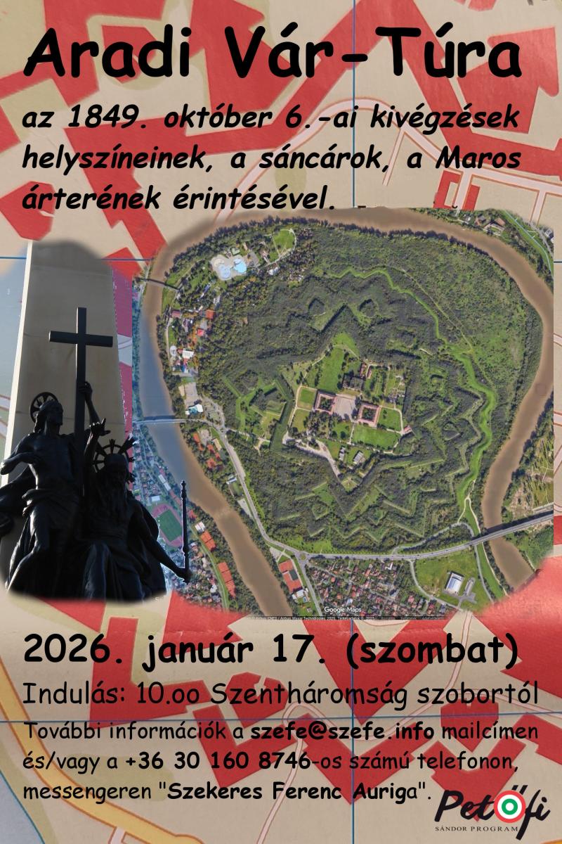 Bár a "bevezetőben" azt ígértem, hogy nem vesszük górcső alá ezeket a helyszíneket, most mégis... Egyrészről, mert 2026. január 17.-én egy hótaposós "várkerülő túrát" szerveztem az egykori aradi kivégzések (legjobb tudomásom szerint azonosított) helyszíneinek érintésével, betekintéssel a vár sáncárkába, valamint kis kalandozással a Maros havas árterén; másrészről pedig, mert előjöttek érdekességek ezzel a témával kapcsolatban... Ezen a túrán egy tucat kalandozásra kész rettenthetetlen magyar vállalkozott az aradi vár (kör)bekerítésére.