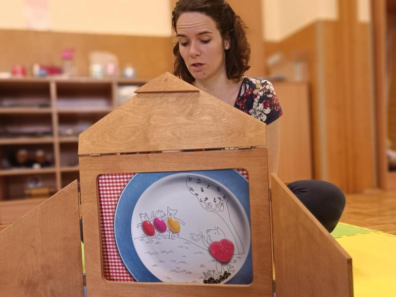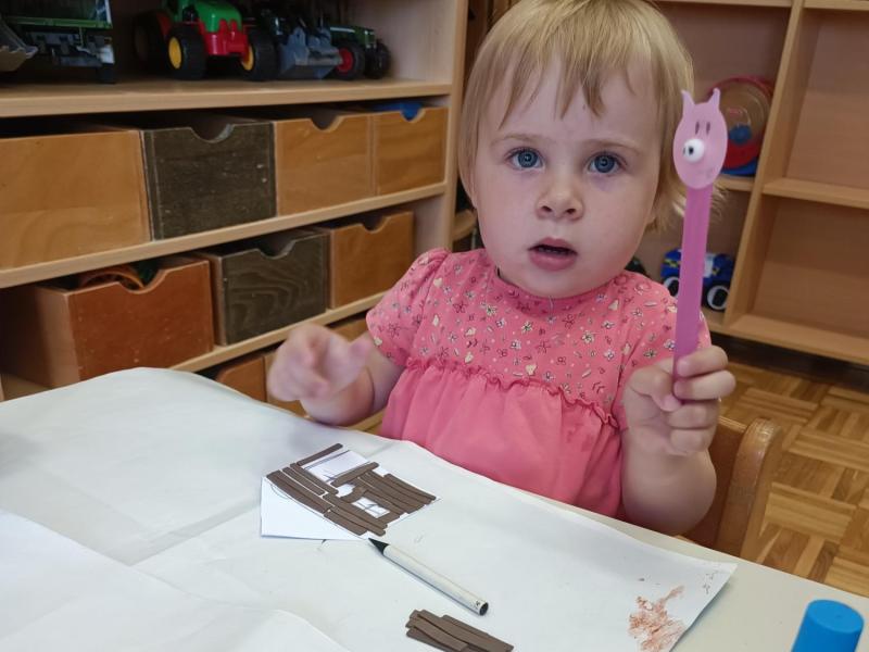„A három kismalac” című mesét adtam elő Papírszínház segítségével. A gyerekek nagyon élvezték a történetet, különösen úgy, hogy sokan ismerték már, így együtt nagyon jól össze tudtuk rakni a történet fonalát. Miután meghallgatták a mesét, közösen énekeltük az „Egy kis malac röf...” kezdetű dalocskát.