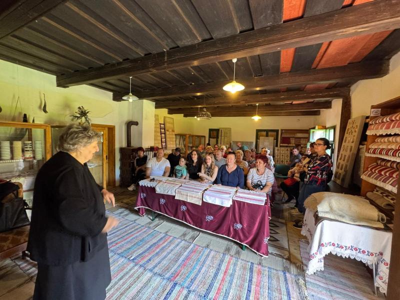 A templomtól gyalog folytattuk utunkat, majd megálltunk egy 1840-ben épült lakóház (napjainkban népművészeti alkotóház, kiállítóterem) előtt, ahol Kisné Portik Irén, szászrégeni születésű néprajzkutató, szakíró, szakoktató fogadott minket. A ház padokkal és vitrinekkel berendezett szobájába, egy saját gyűjtésből származó textileknek, varrottasoknak, csontból készült használati tárgyaknak is helyet adó kiállító térbe invitált minket.