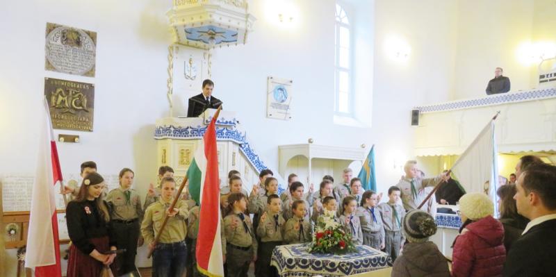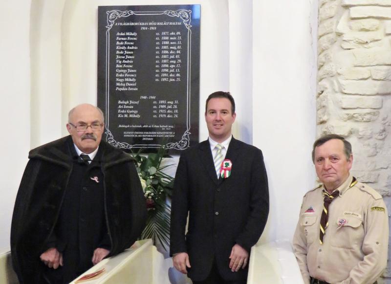2018. március 18-án, a magyar zászló és címer napja alkalmából több megemlékezésen is zenei szolgálatot teljesítettünk a 16. sz. Báthory István cserkészcsapattal. Először a különleges kazettás mennyezetéről híres szilágysomlyói református templomban, majd a rejtélyes, dupla falú somlyóújlaki templomban énekeltünk az Istentiszteletek után. Az utóbbi helyszínen ez alkalommal lepleztük le, és koszorúztuk meg az I. és II. világháború hőseinek állított emléktáblát. Mindkét rendezvény során beszédet mondott a Kolozsvári Magyar Főkonzulátus részéről Csige Sándor konzul, aki az emléktábla avatásában is aktív szerepet vállalt. Nagy örömünkre az MTVA szatmárnémeti munkatársai Egyedi Bernadette és Egyedi Zsolt megtiszteltek bennünket jelenlétükkel és videófelvételen örökítették meg ennek a jeles napnak az eseményeit.