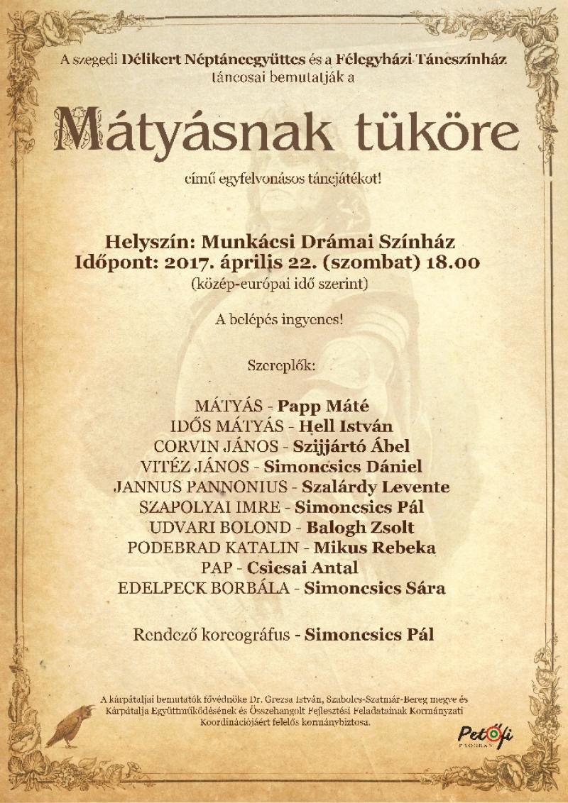 A szegedi Délikert Táncegyüttes és a Félegyházi Táncszínház közös produkcióját, a Mátyásnak Tüköre című táncjátékot április 21-én és 22-én mutatták be Beregszászon és Munkácson. A negyvenfős stáb április 20-án érkezett Kárpátaljára, hogy bemutassa ezt a vegyes műfajt: ami egyszerre néptánc, színház, mese, dráma, komédia és történelmi játék. A Beregszászi Illyés Gyula Magyar Nemzeti Színházban és a Munkácsi Drámai Színházban egyaránt nagy volt az érdeklődés, összesen legalább háromszázan tekintették meg a vendég darabot.