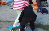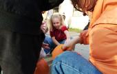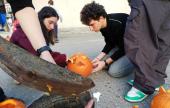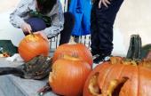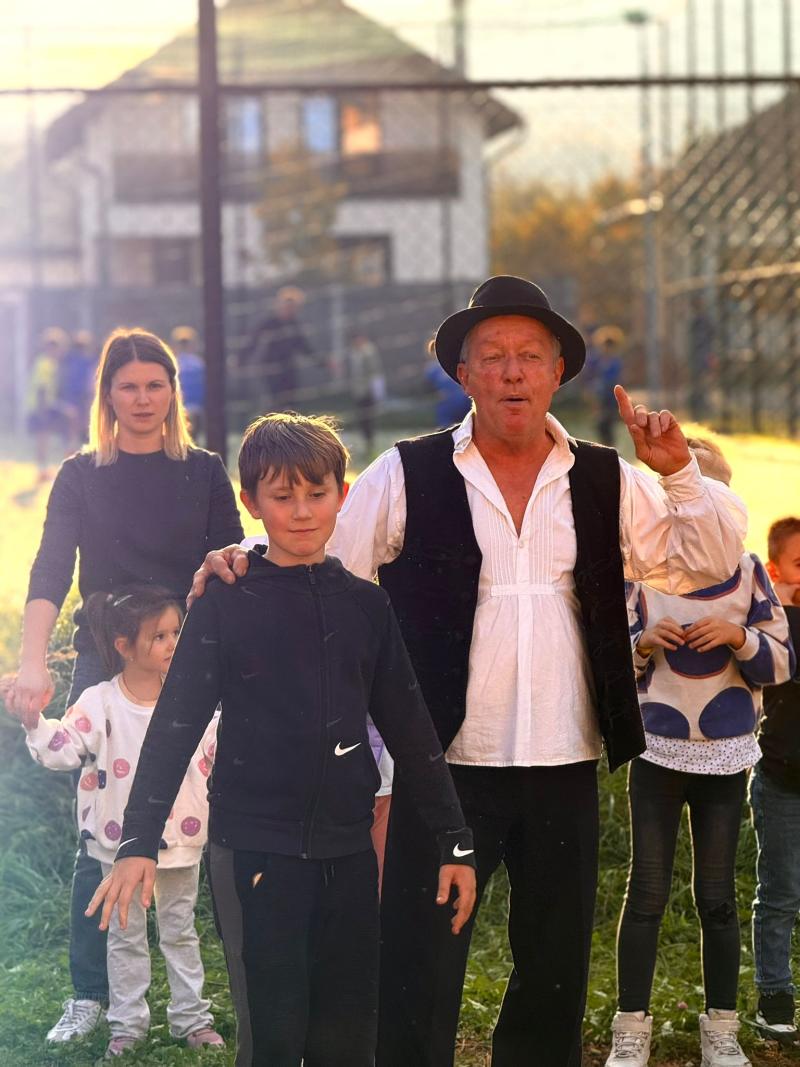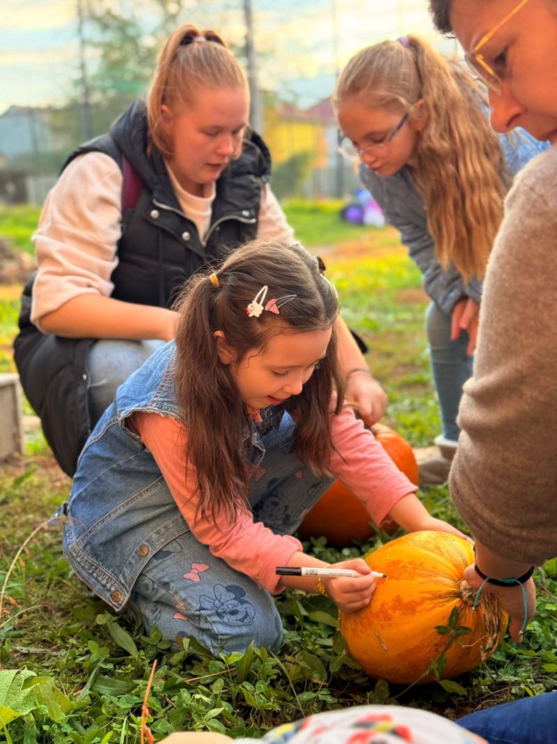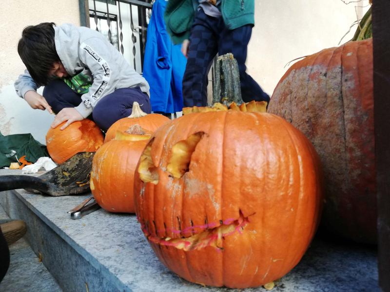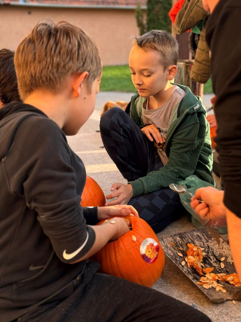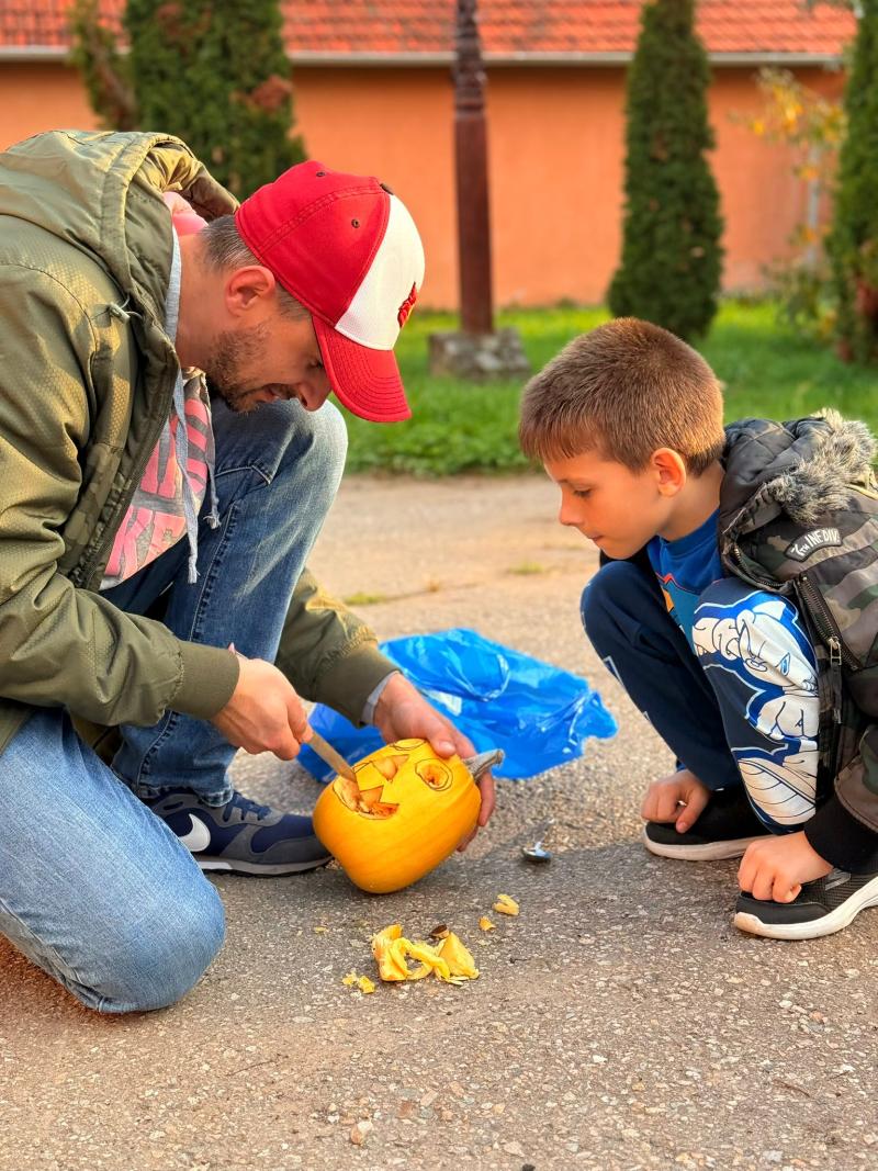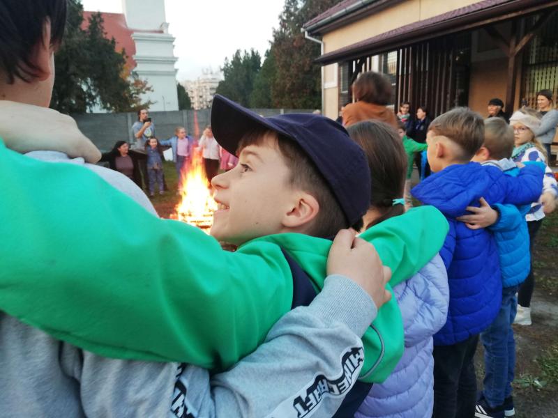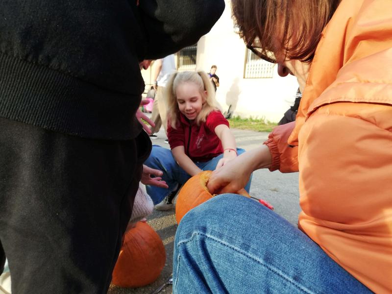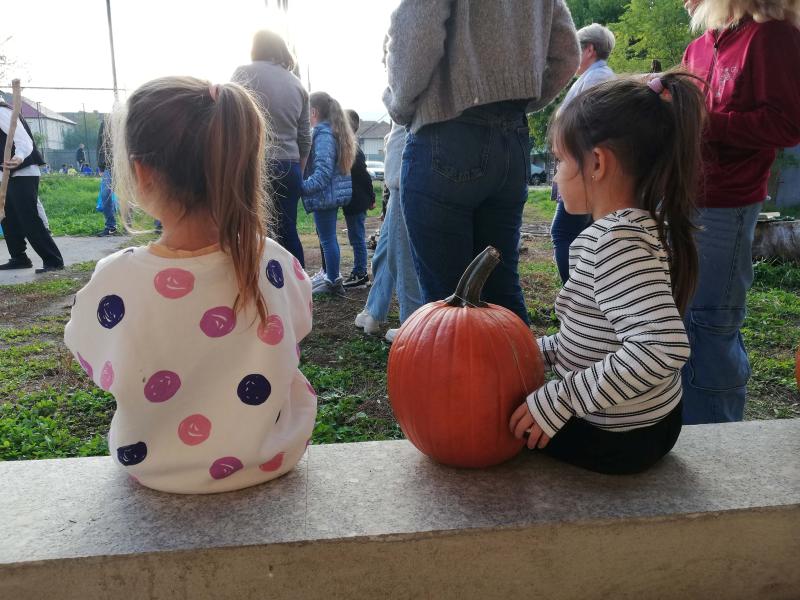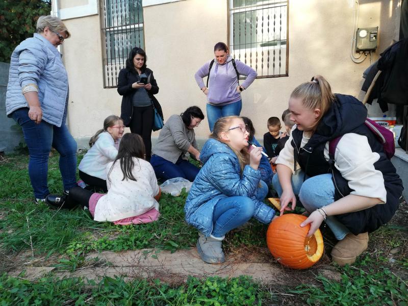 Kés, villa, olló, gyerek kezébe nem való! Mégis… 2025. október 23-án a dévai Magyar Ház udvarán engedélyt kaptak, hogy kést ragadjanak. De, előtte, míg gyűltek… Zsannal és Attilával (két öreg cserkésszel) körbeálltak, énekeltek, ismerkedtek, játszottak. Aztán kezdődött a faragás. Készült csíkos, világos-és sötét narancs, füles macska-töklámpás… klasszikus háromszögszemű, háromszögorral, fog nélkül és fogakkal, nagy mosollyal (vagy vicsorral). A belét kanállal, kézzel… örömmel kimerték. A lámpásokat, amint lement a nap, itt-ott, útmutatásul kihelyezték. Időközben a nagy tűz, meseország fénye kihunyófélben… A gyerekek bőszen jelentkeztek, ők felélesztik a tüzet. 5 fős csapatokban elindultak a szomszédos katolikus templom udvarába, hogy fát szerezzenek. Útközben találkoztak Hófehérkével (akinek az alapanyagok kiválasztásában segítettek, hogy főzhessen vacsorát a törpöknek), a lesántult Piroskával (akitől kosarát elvették, és a fonál -akadálypályán át, kézről-kézre adogatva egész a nagymamáig vitték). A mamánál farkas helyett sárkány... Karmaiból megmenekültek... A tündérkeresztanyák odújáig szöktek (Itt színes bájitalt kevertek). Odébb, sárga gumicsizmás punk kandúr már várta őket. A „macskának” a nagyobbak dalt írtak, a kisebbek énekeltek. Továbbmentek. Mesebirodalom kapuja előtt... A földön, rongyai közt, kártyái fölött kuporgott a hajléktalanná lett király. Nincs mese, neki is segíteni kell! A botokat tettükért megkapták, mind az összeset a tűzre dobták. Újra lobog a láng! Újra pezseg a tűz, feléledt a varázs! (Lehet majszolni a zsíros kenyeret, inni a meleg teát.)