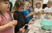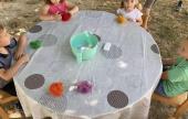 A kreatív tevékenység során a gyerekek szappanos vízzel kis nemezlabdákat készíthettek. A gyapjúrostok összedörzsölésével a gyerekek megformálták a labdákat, miközben fejlesztették a finommotoros készségeiket és koncentrációjukat. Ez a tevékenység nemcsak szórakoztató, hanem fontos a magyar hagyományok szempontjából is, mivel a nemezelés hosszú évszázadok óta jelen van a magyar népművészetben.