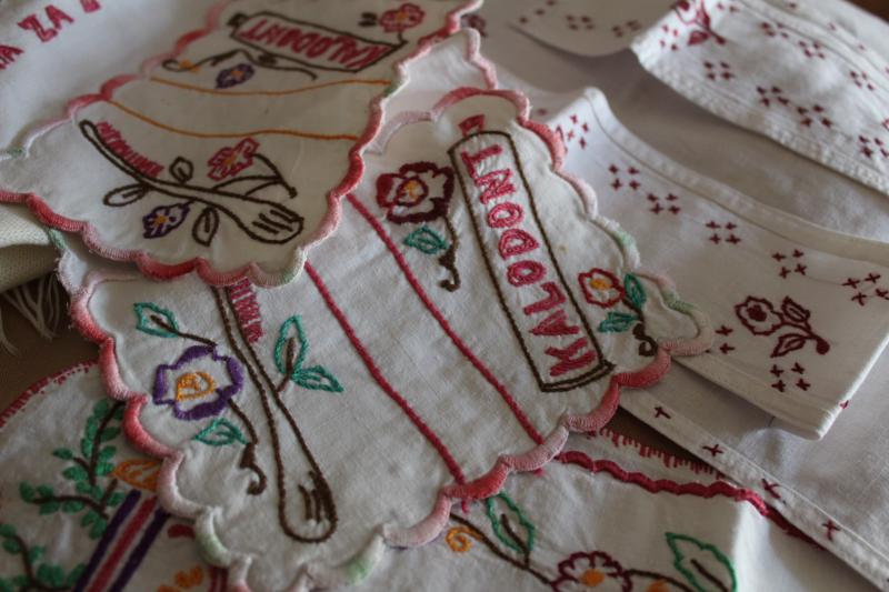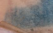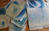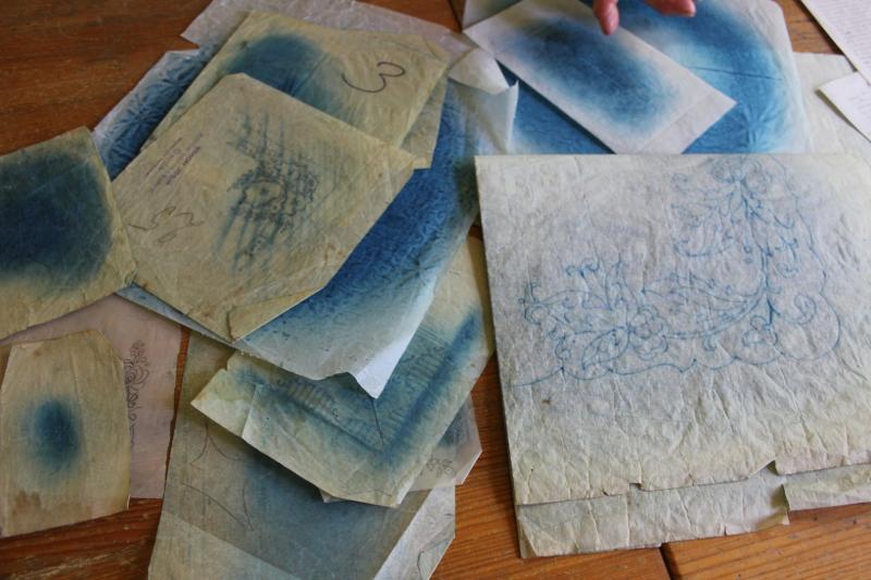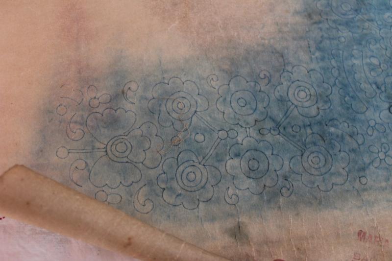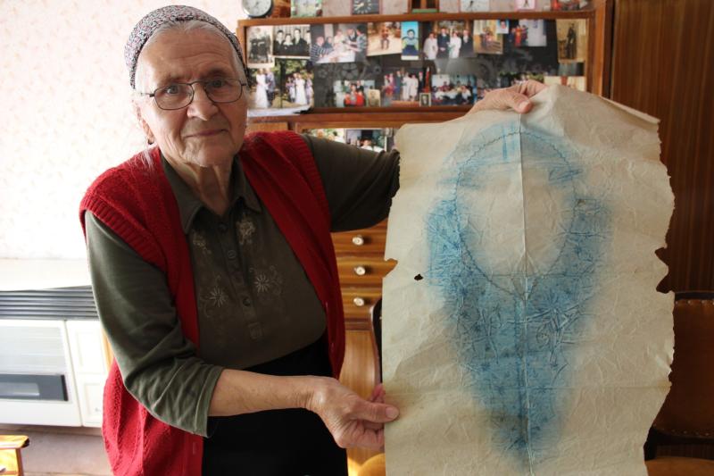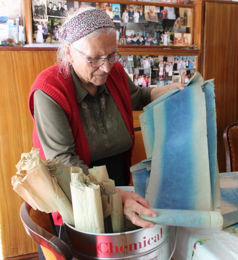 Mivel én főleg az 1940-50-es és a ’60-as évek generációjával beszélgettem, ezért három, esetleg négy egymást követő nemzedék kezén formálódott, lokális hímzésstílust volt lehetőségem megismerni, ami mellett igyekeztem gondot fordítani a pauszpapírok felkutatására is, amiről a mintát vették, hiszen sokat elárulhatnak az adott falu hímzéseinek származási helyéről. Ezek közül Rózsa néninél kimondottan sokat találtam, amiket mára hordókban, feltekerve tárol. Látogatásom azzal vált még különlegesebbé számomra, hogy az ún. trukkolást (drukkolást) magam is kipróbálhattam. Párizsi kék porfestékkel dolgoztam, ami közel 50 éve állt egy kis tálkában és kincsként őrizve azóta is abban van. Egy nyomdaszerű, anyaggal ellátott pecsétet mártottam a porba, majd rávittem a pauszpapírra, amiről az apró, kék szemcsés por átment a vászonra.