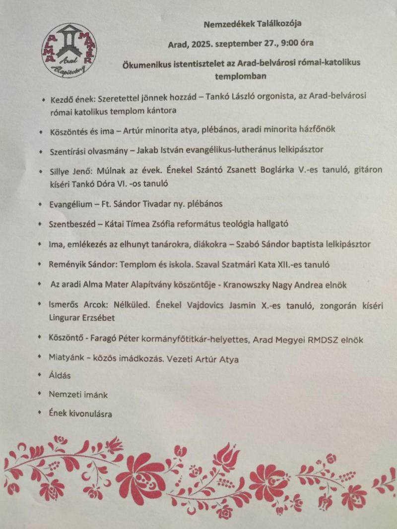 Szeptember 27.-én az aradi Csiky Gergely Főgimnázium kötetlen beszélgetésre várta valaha-volt diákjait és tanárait. A délutánba hajló programsorozat reggeli közös istentisztelettel kezdődött...