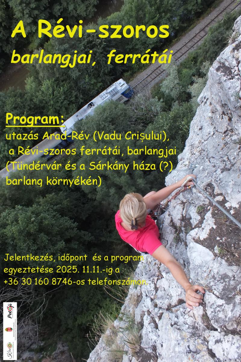 Program: - utazás Arad-Rév (Vadu Crișului), - a Révi-szoros ferrátái, barlangjai (Tündérvár és a Sárkány háza barlang (?) környékén) A program teljes mértékben igazodik az érdeklődők igényeihez, amit (utazás, szükséges felszerelések, pontos indulás/érkezés időpontja, helyszíne) előzetesen telefonon tudunk egyeztetni. A résztvevők számára kettő garnitúra "ferrata-szett"-et tudok biztosítani. Jelentkezés, időpont és a program egyeztetése 2025. 11.11.-ig a +36 30 160 8746-os telefonszámon.