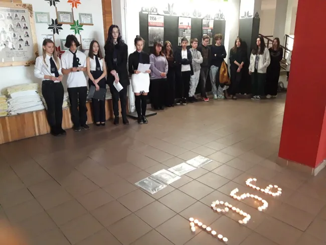 A történelmi események felelevenítését követően égő mécsesekből raktuk ki közösen az 1956-os évszámot, majd a forradalom emlékét őrző verseket szavaltak a diákok. A versek közül elhangzott az erdélyi származású Bartis Ferenc "Utószó" című költeménye, melyet követően a szerzőt 7 év börtönbüntetésre ítélték. Képek bemutatásával név szerint is megemlékeztünk a forradalom néhány ifjú áldozatáról. A szabadságharcosoktól kevéssel idősebb fiatalok harcoltak a szabadságért.