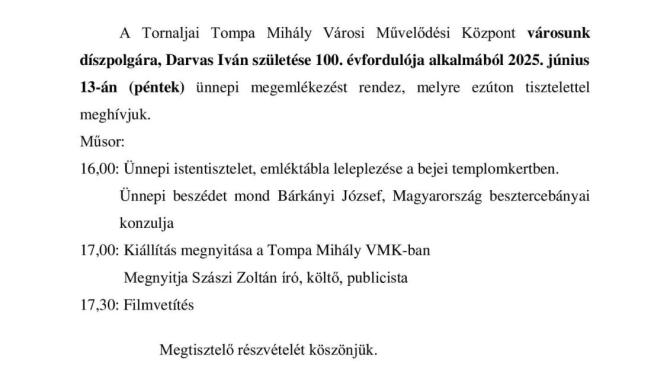 Darvas Iván 100 éve született a ma Tornaljához tartozó Bejében. Ezen évforduló alkalmából ünnepi programokra várják…