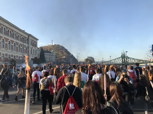Utazásunk első megállója a Lakiteleki Népfőiskola volt. Mindannyian elfoglaltuk a szálláshelyünket, megebédeltünk, s felkészültünk a budapesti útra. Délután 3 órakor csatlakoztunk a Budapesti Műszaki Egyetem előtt a megemlékező diákokhoz. Itt tudatosult a fiatalokban, hogy első ízben találkozhatnak a világ magyarságával, hiszen voltak itt a Kárpát-medence minden régiójából és még az óceán túlról is, szórványból és diaszpórából középiskolások és egyetemisták. A fáklyás felvonulás előtt szem- és fültanúi lehettünk a Műegyetem aulájában zajló 1956-os emlékünnepségnek, melyet az egyetem előtt kihelyezett óriáskivetítőn nézhettünk végig. Az emlékünnepség végéhez érve a Rákóczi Szövetség fiatal aktivistái már osztották a fáklyákat és a magyar zászlókat. „Felfegyverkezve” elindult az ünneplő diáksereg a Bem térre. Az, hogy több ezer határon túli fiatallal közösen indulhattunk útnak ezen a felvonuláson, már az is felemelő élmény volt számunkra. Mi is megtettük azt az utat, melyet 1956-ban azok a bátor fiatalok, akik az orosz megszállók ellen fogtak fegyvert és vonultak a pesti utcára. A Bem téri koszorúzást követően visszamentünk a buszokhoz és elindultunk a MOM Sportközpontba, ahol részt vettünk a Rákóczis Légy-Ott! középiskolás találkozón, majd a Bagossy Brothers Company koncertjével ért véget kalandos napunk.