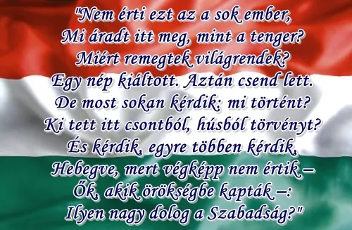 „Az 1956-os forradalom megőrizte a nemzet öntudatát, és mindenhol életben tartotta a szabadság emlékét. Nem kétséges, hogy a győzelem utólag született, de az emberség mégiscsak felülkerekedett, hiába tiporták rendőrcsizmákkal.” David Pryce-Jones, a National Review korábbi szerkesztője (2006)