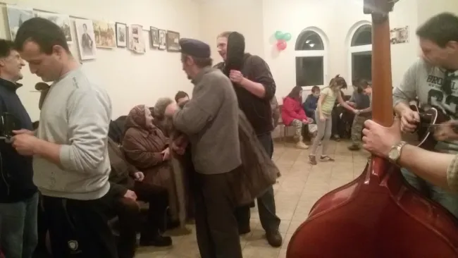 Édesapád korosztályából van itt még 10-12 ember. Viszont korombelit alig-alig látok. A tánccsoportból csak két-három nagyobbacska lány csapódik hozzánk fiú egy sem.