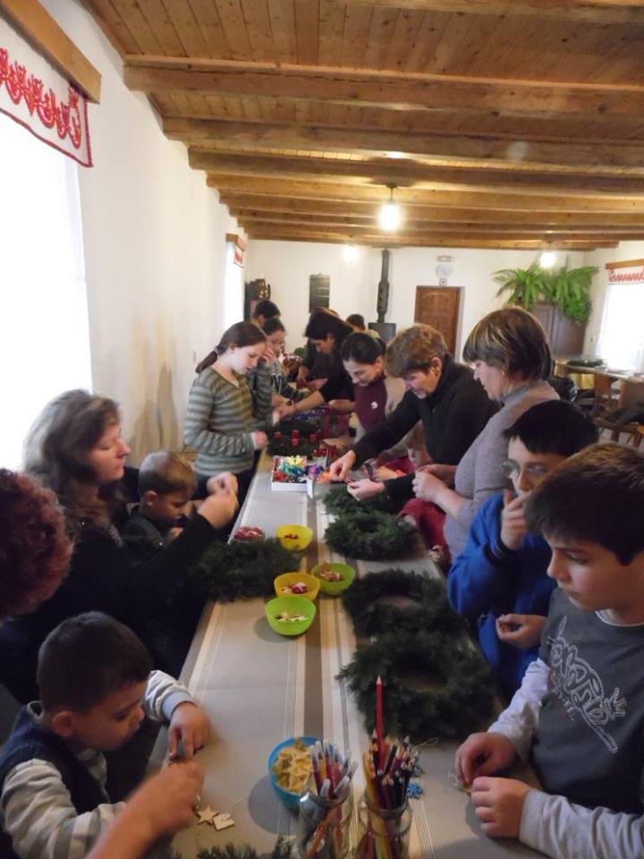 A nap első felében a kicsiké volt a főszerep, akik az előzőleg a felnőttek által gondosan előkészített koszorúalapokat díszíthették fel ki segítséggel ki pedig segítség nélkül. Az közös éneklésekkel tarkított barkácsműhely mindvégig megvolt telve lélekkel. A gyerekek őszinte, kiváncsi, játékos munkakedve és a szülők átérezhető, önzetlen szeretete, mintha kiragadta volna ezt az eseményt és vele együtt az egész falut az egyre gyorsabban rohanó világ rideg valóságából.