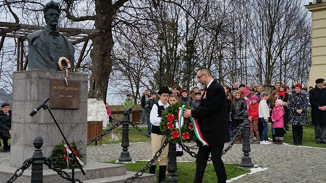 2016. március 15-én, 15 órakor a segesvári Petőfi Szobornál koszorúztunk, mely a magyar katolikus templom mellett áll, a Petőfi Sándor téren. Az ünnepi megemlékezést Jakabházi Béla tanár úr nyitotta meg. "Nekünk is meg kell vívnunk a magunk forradalmát, a lélek forradalmát. Képesek vagyunk-e összefogni és együtt, közösen cselekedni azért, hogy a szabadság, egyenlőség, testvériség fogalmak, ne csak politikai szónoklatok közhelyei legyenek? Hogy az anyanyelv szabad használata ne kiváltság, hanem természetes emberi jog legyen és maradjon. Sokszor csüggedve, belefáradva, reményt vesztve cselekszünk, pedig arra van szükség itt, hogy munkálkodjunk tudatosan, elszántan, célratörően."