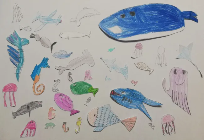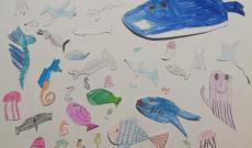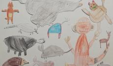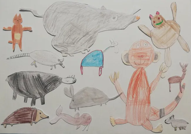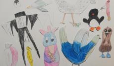 Több száz barmot, temérdek madarat, csúszómászót és vízi állatot rajzolnak, színeznek (és tépnek, gyűrnek, áthúznak, radíroznak.)