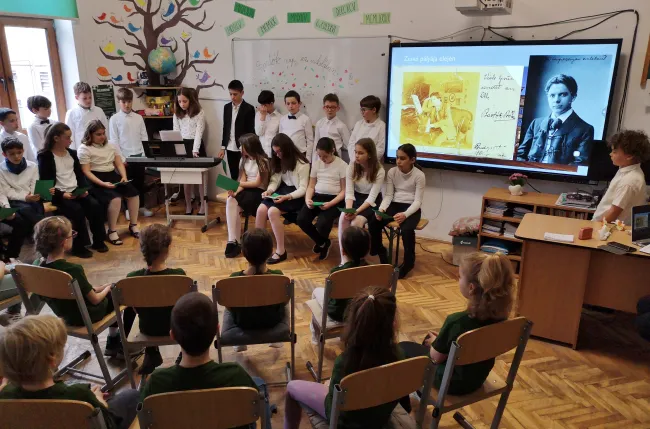 A hagyományos negyedik osztály Bartók, a zeneszerző, zongoraművész, népzenegyűjtő életéről és zenei munkásságáról tartott bemutatót iskolánk népes közönségének, kisebb és nagyobb diákjainak, tanítóknak, tanároknak. Pál Krisztina tanító néni készítette hozzá a kiválóan felépített digitális előadást, látványos képekkel, illusztrációkkal, idézetekkel. Ezúton is hálásan köszönjük neki, mindnyájan sokat tanultunk, tanárok és diákok egyaránt, az interaktív előadás anyagából!