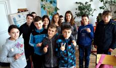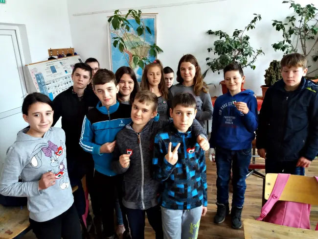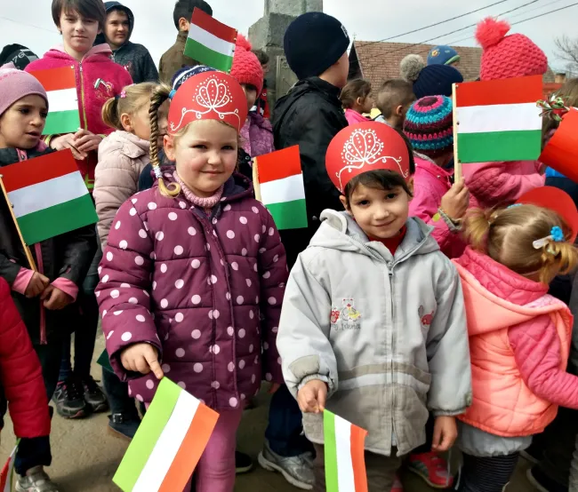 Az elmúlt napokban, ha az iskola falai között jártunk, már kihallatszott az ajtók mögül néhány Kossuth-nóta dallama. Az ovisok, felső- és alsó tagozatos tanulók egyaránt versekkel, dalokkal készültek az 1848-49-es forradalom tiszteletére, illetve a nagyobbak a Pilvax kávéházban történteket és a „12 pontot” elevenítették fel. E mellett ügyes kezek készítette csákók, párták, zászlók és kokárdák is kivonultak pénteken a falu központjába. A tanárok és diákok évek óta szereznek meghitt pillanatokat az apró magyar falu lakóinak, hiszen a megjelent egyházi vezetőkkel és a helyi lakosokkal együtt ünnepelnek. Március idusára emlékezve a felső tagozatban együtt néztük meg az Utolsó órák című filmet, melynek kapcsán felidéztük a történelemórákon a forradalomról tanultakat is.