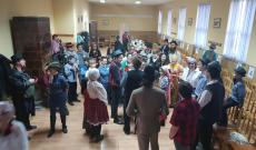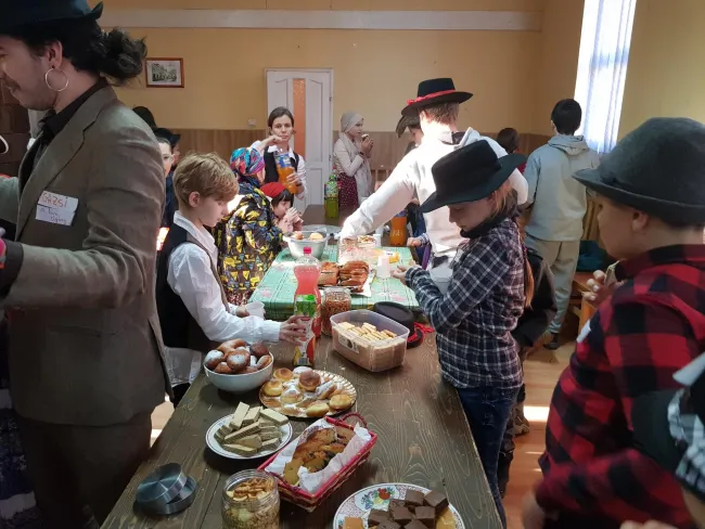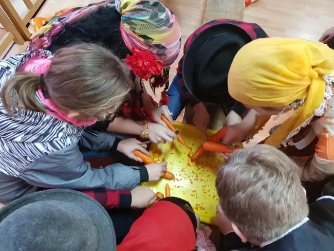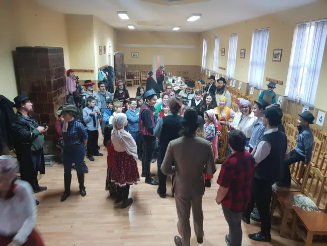 Ezután családokba osztottak minket, hogy a felmerülő problémákat közösen tudjuk megoldani. Az első feladat rögtön az volt, hogy próbáljuk meg elrabolni a menyasszonyt. Igyekeztünk csellel, rábeszéléssel, furfangos ötletekkel, de nem tudtuk sehogy megkaparintani. Ennél a próbatételnél mindenki kudarcot vallott, elkezdtük volna hát a vacsorát a tyúkhúslevessel, de mint kiderült még neki sem fogtak az elkészítésének, így nekünk kellett besegítenünk. Nagy versengés indult a családok között a répapucolásban, de mivel kés nem akadt, helyette mindenki csak kanalat kapott. Miután meghámoztuk és megmostuk a zöldségeket akkor derült csak ki nagy csodálkozásunkra, hogy a tyúkok még kint szaladgálnak az udvaron, így azokat is össze kellett szednünk valahogy. Szerencsére a tyúkokat labdák helyettesítették, ha nem így lett volna, talán még most is a tyúkokat hajkurásznánk. Miután az összes labdát labdát felszedtük, hatalmas fogócska kerekedett ki a játékból. Futkározott mindenki az udvaron jobbra-balra, amerre csak értük. A nagy rohangálás után megéheztünk, hát neki is fogtunk a nagy lakmározásnak. Úgy tömte mindenki a hasát, mintha harcolnia kéne az utolsó falatokért, de teljesen felesleges volt a nagy sietség, hiszen volt bőven étel, sok meg is maradt. A vacsora végeztével minden család odaadta a nászajándékot az ifjú párnak, majd a tánc következett.