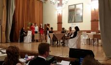 A tanárok is készültek egy kis műsorral, ez már a gólyabál elmaradhatatlan része. Természetesen az erre való felkészülés is titokban zajlott. Picit kötődött a diákok színdarabjához. A líceum tanárai úgy vélték, hogy ne csak a 9.-es diákokat tegyék próbára, hanem egy másik, újonnan érkezőt is, engem, a Petőfi Program ösztöndíjasát. Részt vehettem naponta, minden este, sokszor az éjszakába nyúló próbákon, és egy nagyon jó csapat tagja lehettem, mely sok nevetéssel is járt. Mi is készültünk tánccal, és az elmaradhatatlan énekkel, ami számomra már kötelező volt. Felcsendült az Elisabeth musicalből Sissi dala és a My Fair Lady egyik legismertebb dalára, a Ma éjjel táncolnék című dalra táncolt a teljes tanári kar báli ruhában bécsi keringőt. A tánc látványos volt, melyre Nora Loanovici tanárnő készítette fel a fellépőket. Nóra tanárnő 40 éven át hivatásszerűen táncoktató volt, táncosai komoly eredményeket értek el nemzetközi és európai táncversenyeken. Köszönjük neki a fáradságos munkát, a gyönyörű koreográfiát, aki hihetetlen energiáival, aktivitásával, belülről fakadó eleganciával volt jelen a próbákon, és kihozta a csapatból a maximumot.